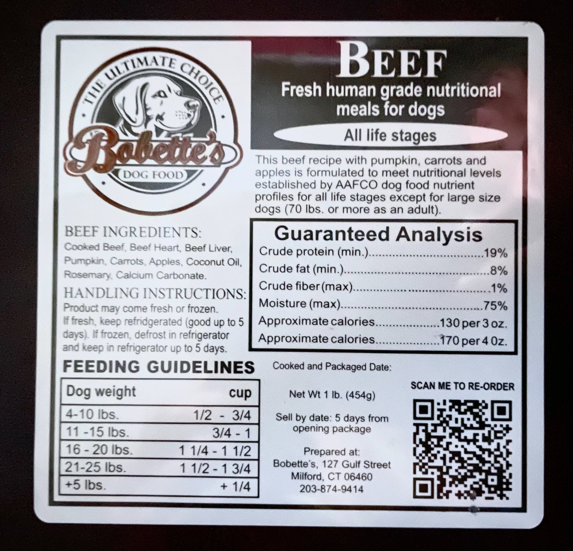 Receive 1 Pound of Bobette's Beef Dog Food per week for one month. This fresh dog food is made with 80/20 ground beef, veal hearts, beef liver, pumpkin, carrots, apples, coconut oil, calcium carbonate (equivalent to ground egg shells) and rosemary.